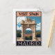 A majestic vintage-style travel poster inviting you to Visit Spain and the grand city of Madrid. This stunning illustration features an ornate, classical stone archway and statue, which frames a picturesque view of the red-tiled rooftops of the city below and the rolling Spanish hills. The artwork perfectly captures the grand architecture and scenic beauty of the region. Ideal for travel enthusiasts, collectors of retro illustration, and lovers of Spanish culture and history.