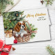 On this Holiday card, an adorable Cavalier King Charles Spaniel puppy lays in his wicker basket bed in front of a decorated Christmas tree. Also behind the basket is a pretty red holly berry and pine cone bouquet. The gold script text at the right says "MERRY CHRISTMAS", with HAPPY NEW YEAR in green below it. All the text, inside and out, may be easily changed to anything you'd like. You can see more Spaniel images, as well as other breed images, at Dog Village.