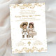 Celebrate the baptism of your precious twins with this Spanish Gold Charro and Charra Twin Baptism Invitation. Featuring adorable twin babies dressed in complimentary traditional charro and charra outfits. The charming design showcases a gold glitter and decorative leaves background, and a beautiful gold cross. This invitation is ideal for a meaningful baptism ceremony, bringing together family and friends to celebrate this sacred occasion. The high-quality print ensures that every detail shines, making it a memorable keepsake for years to come. Personalise this invitation with your event details to create a one-of-a-kind announcement that reflects the joy and significance of this special day. Make your twins’ baptism an unforgettable event with this beautifully designed invitation.