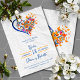 Inspired by indigenous flower illustrations, this Mexican theme wedding invitation showcases a heart adorned with orange, blue, pink, and red flowers painted in intense colours. The heart is framed by the silhouette of another heart, with bright orange butterflies flying around, creating a stunning and colourful design. The paper features a surface with the elegant, textured look of cotton paper, though it is not made from cotton, adding a refined and sophisticated touch to your wedding stationary.