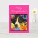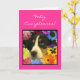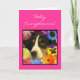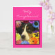 Tarjeta postal en espanol con foto de un perrito muy lindo y florecitas. Greeting card in Spanish for a girl's birthday with photo of a puppy and flowers. Also available in English and Portuguese. Photography by Maria Santos ( Lusinhas do Sul)
