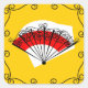 Whimsical design drawn in a retro style featuring a lacy fan souvenir from a Spanish holiday on a golden yellow background. A customisable design in black, white, red and yellow for you to personalise with your own text, images and ideas. An original digital art image.