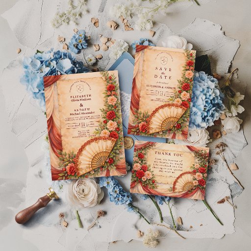 Inspired by sun-washed Spanish courtyards and old-world Mediterranean architecture, this romantic wedding design blends warm terracotta tones, lush orange trees, and classic stone details into a timeless composition. The painterly illustration evokes an intimate European setting—perfect for couples drawn to destination weddings, heritage aesthetics, or refined Old World charm.