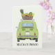 Spanish Mejórate Pronto Get well card. A green retro Fiat 500 in watercolor and basket with fruit
