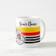 Whimsical design drawn in a retro style featuring souvenirs from a Spanish holiday; a wrought iron guitar, lacy fan and red rose on a striped background. A customisable design in black, white, red and golden yellow for you to personalise with your own text, images and ideas. An original digital art image.