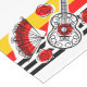 Whimsical design drawn in a retro style featuring souvenirs from a Spanish holiday; a wrought iron guitar, lacy fan and red rose on a striped background. A customisable design in black, white, red and golden yellow for you to personalise with your own text, images and ideas. An original digital art image.
