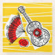 Whimsical design drawn in a retro style featuring souvenirs from a Spanish holiday; a wrought iron guitar, lacy fan and red rose. A customisable design in black, white, red and golden yellow for you to personalise with your own text, images and ideas. An original digital art image.