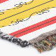 Decorative retro design with a Spanish flavour featuring a stripe in gold, red and white and black swirl embellishment. A customisable design in black, white, red and golden yellow for you to personalise with your own text, images and ideas.