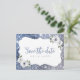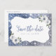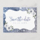 Faux sparkle silver and blue glitter frame and "save the date" script with dusty blue and white floral, elegant and stylish. Great save the date postcard for modern wedding, romantic wedding, and botanical garden wedding.