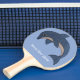 This ping pong paddle is light blue with a fun dolphin in a jumping position who is a sparkling dark blue with a white stomach. Customise your text with the template.