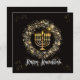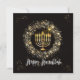 Hanukkah party design with a gold menorah and silver and gold sparkles on a black background.