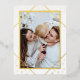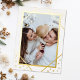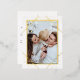Personalise this Christmas holiday card featuring real gold foil (Front side only) to accompany your own personalised photo adorned with gold sparkle dots and snowflakes. On the back, script typography on a black and white background makes for a simple yet elegant style.