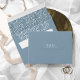 A handwritten, signature font combined with geometric frames, sparkly backgrounds and lush florals are used in this collection to set a warm and intimate tone for your wedding. The coordinating envelope shown here features a sparkling glitter interior in dusty blue tones with an optional solid, light blue exterior. Easily add your initials and address to the back flap using the provided template. Search ID889 to see all the products in this wedding set.