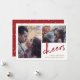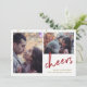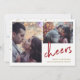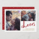 This modern holiday card features two of your personal photos, with faux gold sprinkles and the word "cheers" in elegant red handwritten script. The back of the card is red with more faux gold sprinkles.