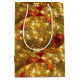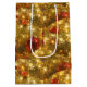 Glamourous Christmas gift bag with red and golden Christmas baubles, sparkling lights, tinsel and Christmas tree branches