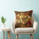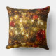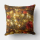 Glamourous Christmas throw pillow with red and golden Christmas baubles, sparkling lights, tinsel and Christmas tree branches.