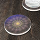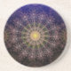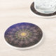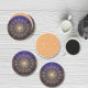 The art of sparkling night flowers, strung through geometric circles with a mandala mood, that is calm, cheerful, and uplifting. The combination of the two basic contrast opposite colours in the background, light with blue above and dark with brown in the lower area, flanked by yellow which is those two colours mixing, shows the achievement of a mood from melancholy to calmness.
