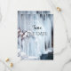 A romantic winter wedding Save the Date card featuring a frozen waterfall with sparkling light snow flakes and candles.