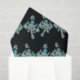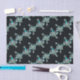 Artwork is a repeating pattern featuring intricate jewelled designs. Each design showcases an ornate, symmetrical formation with a prominent turquoise gem at its centre. Surrounding the central gem are delicate silver embellishments and smaller greenish elements, resembling gemstones or crystals. The structures give an impression of luxurious, decorative pieces, possibly resembling chandeliers or brooches. The background is black, providing a stark contrast that highlights the bright and detailed jewels, adding depth and elegance to the overall composition. Perfect for decoupage or gift wrap.
