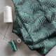 Turn the glam up a notch with this unique tropical print of overlapping palms leaves in a seamless pattern that adds a little sparkle and depth of shadows to the lush foliage. This version is glittering shades from light teal to deep sea green. Search ID831 to see other colour options and additional products with this design.