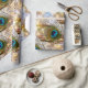 Glamourous holiday wrapping paper with beautiful peacock feather, silver tinsel and sparkling Christmas lights