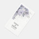 A sparkling silver and mauve wedding napkin featuring a watercolor floral of mauve peonies and silver grey eucalyptus greenery with splashes and splatters of silver ink dots with your names and details in a modern san serif font.