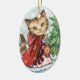 This cute brown tabby cat is hanging a Christmas ornament outside on a fir tree. She loves her new winter cloak, which is decorated with snowflake stars. Artwork by Carmen Medlin.