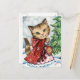 This cute brown tabby cat is hanging a Christmas ornament outside on a fir tree. She loves her new winter cloak, which is decorated with snowflake stars. Artwork by Carmen Medlin.