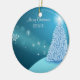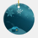 Sparkling cosy snow landscape with a swirling snow storm and a little cute cabin. A Christmas tree is lighting up the landscape with a bright sparkling star. The perfect personalised Christmas ornament.