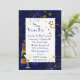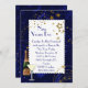 Elegant New Years Eve party invitation done in gold tone and dark blue, with a lovely scalloped edge white text area, in the middle, and a pretty dark blue background. Graphics of gold tone stars and a champagne bottle and glass decorate all around the text area. Text, in blue, is ready to personalise for your New Years event.