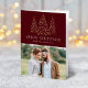 Modern & elegant holiday card featuring your photo complimented by three snowy faux gold foil pine trees with a burgundy background (or color of your choice). "Merry Christmas" is displayed in a white, modern serif font with your name or custom text below. The inside of the folded holiday card features your custom message. The back of the card features an additional photo.