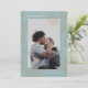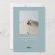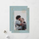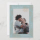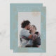 This New Years photo card features a border of gold fireworks and sparkly white stars on a minty turquoise blue background. The back has an additional photo and space for a longer message.