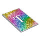 The background is a faux chunky yellow, pink, purple, blue, teal, green and gold ombre gradient glitter with sparkly spots and blurry bokeh sparkles.