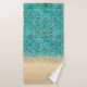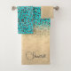 On this stylish towel set is a gold metallic sheen on the bottom of the large towel where you can personalise it then a glittery gold pattern that blends into a glittery silver leopard print with a turquoise backdrop for extra pop. Glam chic vibes.