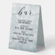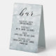 A sparkly icey dusty blue wedding or special occasion bar menu featuring a dusty ice blue bokeh bubbles background and a swash script for the word, "bar."
