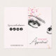The design combines business card functionality with appointment card and is a lavish blend of glam and minimalist aesthetics, featuring a blush pink gradient background that exudes luxury. It features a confetti like, multicolor sparkly stars glitter, giving it a girly and festive touch. The central black illustrations of lash extensions emphasize the theme of beauty and elegance. Custom name and profession is elegantly scripted in burgundy purple, resonating with makeup artists, brow bar professionals, beauty salon owners, lash extension specialists and esthetitians. The card has provisions for a custom QR code and personalised social media icons and your company address offering a seamless blend of functionality and style. Glitter elements lend a subtle shimmer, enhancing the card's upscale, lash bar vibe, while keeping the overall look clean and uncluttered.