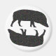 This magnet has two sparkly pigs on it, one upside down and the other the right way up. Both pigs are black and covered in tiny multicoloured dots.