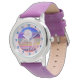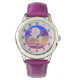This is a pretty watch that any little girl would love! It features a sparkly pink rearing unicorn image against an abstract blue, purple, pink and yellow striped iridescent style background. Her name is in white at the lower left. The blue numbers on the outside pale pink border makes the watch easy to read. This design looks great with several of the wrist band colours, too...check them out!