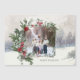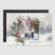 Elegant winter design featuring photo template with leafy filigree border at a slight angle framed with watercolor winter roses, pine cones, evergreen boughs, eucalyptus and holly. Background features snowy woodlands with snowflakes and soft gold sparkles.