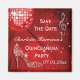 Elegant, glamourous Quinceañera Birthday save the date magnets. Trendy glitz and glamour Save the dates for your quinceañera birthday party celebrations. Beautiful, dazzling silver sparkles diamonds bling jewels musical note image, funky red retro disco mirror ball and silver glittery stiletto high heel fashion shoe image on a chic red background. A cute, classy, fashionable, stylish, pretty save the date magnet for teenagers. Teens will love this cool, fun, funky, girly design for their glamourous music and dancing quinceañera parties.