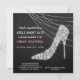 This elegant Bachelorette Party invitation features a silver faux rhinestone or diamond stilleto heel shoe on a dramatic black background. Behind the shoe is a glittery multiple light string. Your custom text is in white and pink at the left and bottom. The back of the invitation is matching pink.