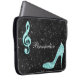 Elegant, glamourous Personalised Laptop Case. Beautiful, dazzling, trendy printed image teal blue / turquoise sparkles diamonds bling jewels musical note and stiletto high heel fashion shoe on a chic black sparkly glitter printed image background. A cute, classy, fashionable, stylish, pretty gift for her or any music lover. Women and teenage girls will love this cool, fun, funky, girly design.