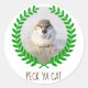 Image of a serious and rather formidable looking house sparrow bird, a green laurel wreath around the noble avian warrior, a distinguished representative of the backyard air force, the text PECK YA CAT under the image. This mini-eagle sure can peck and maybe he can do something more interesting. The product is customisable. You can change or delete the template text. Feel free to use the CUSTOMIZE button to fine-tune the design, to change fonts and colours in accordance with your needs and wishes. Have fun and laugh. Round sticker for anyone.