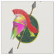 A colourful illustration of a spartan warriors helmet, shield and spear. The helmet is illustrated with bright colours.