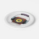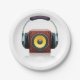 A speaker with headphones on it. This design looks really effective on these Paper Plates