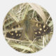 This stunning sheet of round stickers features a photograph of a British butterfly species called the Speckled Wood (Pararge aegeria). The butterfly is sitting on the ground. It has its wings partially open revealing the eyespots and the pretty brown and white markings that give the species its name.