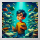 Lost in a sea of books, a boy with glasses stands tall, embracing the wonders of knowledge and learning.