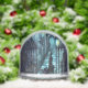 This haunting, graphic photo displays, a tall, ancient-looking, wrought iron, gate entrance. In the courtyard, at the base of the steep, steps stands, a ghostly figure, swathed in flowing, black cloth-at the top of the steps, on a hill, is a huge, gothic-looking, mansion, shrouded in thick fog, highlighted by this spooky phrase, "Enjoy A Boo-tiful Holiday", in oozing, dripping, black font!