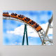 Photograph of an orange roller coaster speeding along the track against a light blue sky