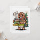A joyful, cartoon-style Gingerbread Man, depicted with a wide, enthusiastic smile and rosy cheeks. He's wearing a simple white apron and heartily holding up a clear mug filled with dark, steaming coffee, with a prominent plume of steam curling upwards. The text "Spicy and Caffeinated" is creatively integrated onto the coffee mug in a bold, vibrant, multi-colored font, featuring subtle star and flake embellishments. In the background, a minimalist yet festive green Christmas tree is adorned with red and gold baubles, topped with a star, and radiating faint yellow light rays. The overall style is clean, cheerful, and graphically strong, with clear outlines.